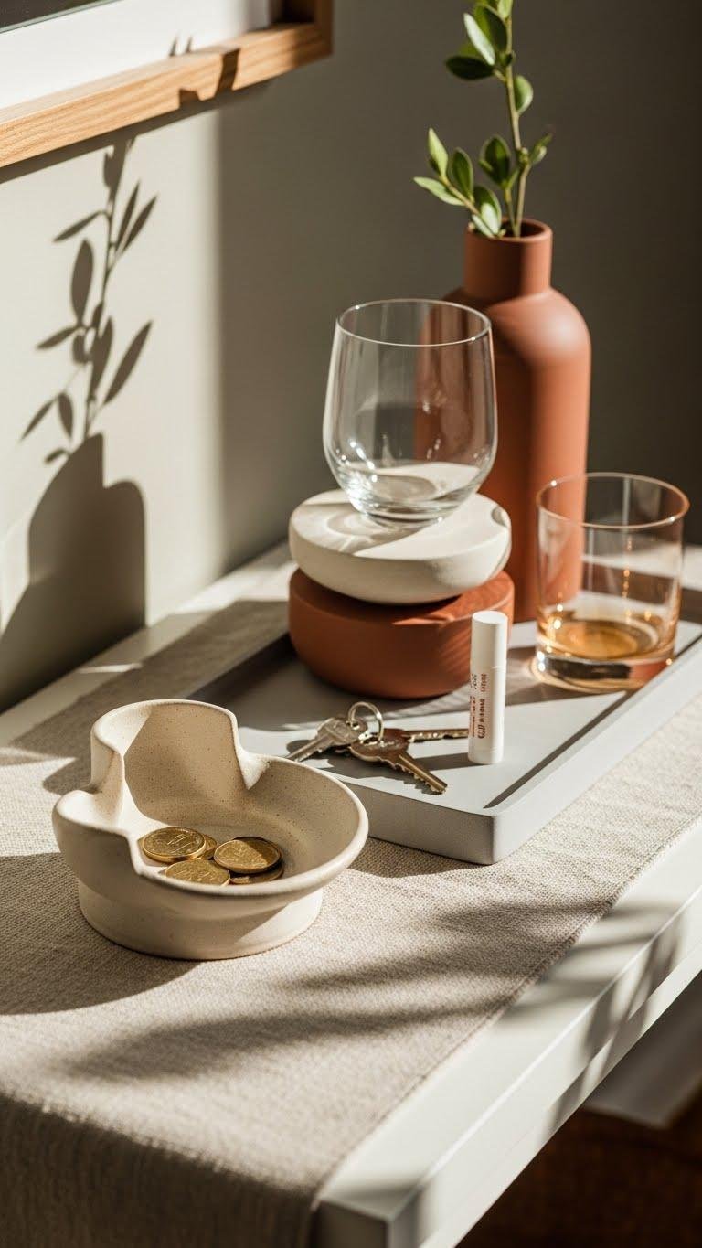 Choose a sleek catchall that doubles as an entryway valet — minimalist metal or matte ceramic — and keep a portable keytray and compact organizer for receipts and coins. You’ll grab and go, feeling unburdened and stylish.