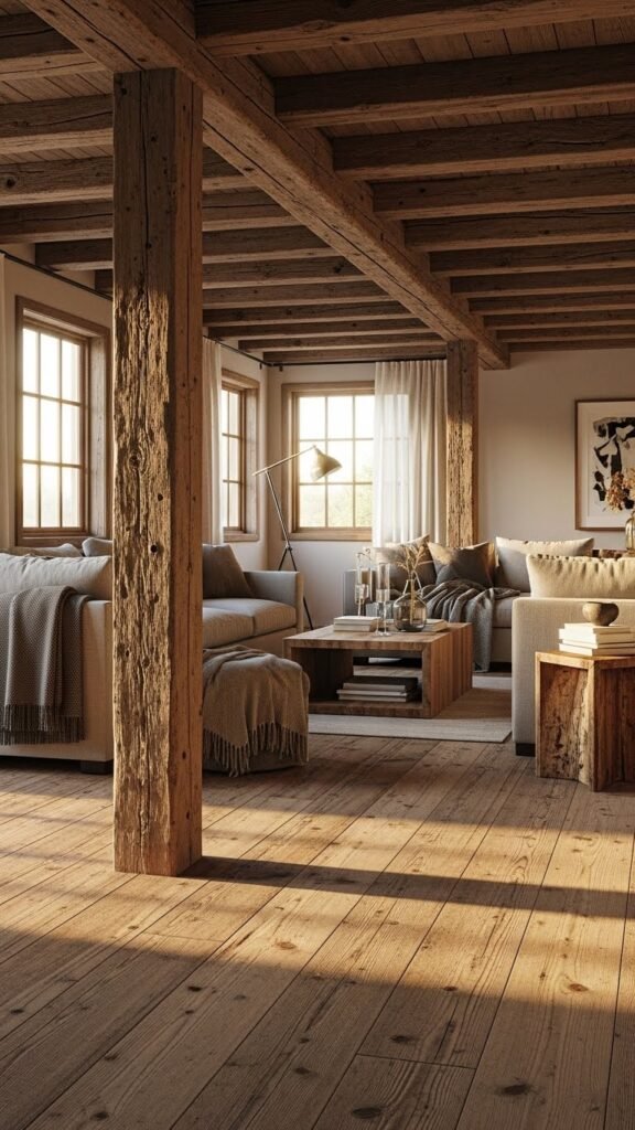 Bring reclaimed wood into your home to add instant warmth and authentic character—think wide-plank floors with lived-in patina and exposed beams that trace the ceiling like weathered ribbons.