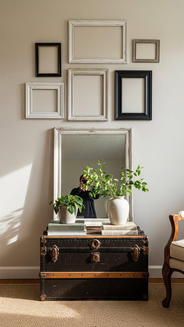 Bring out a few carefully chosen vintage pieces to give your farmhouse decor character without cluttering the space. You’ll mix thrifted frames on a pared-back gallery wall, pair a weathered mirror with fresh greenery, and use upcycled trunks as occasional tables or storage.