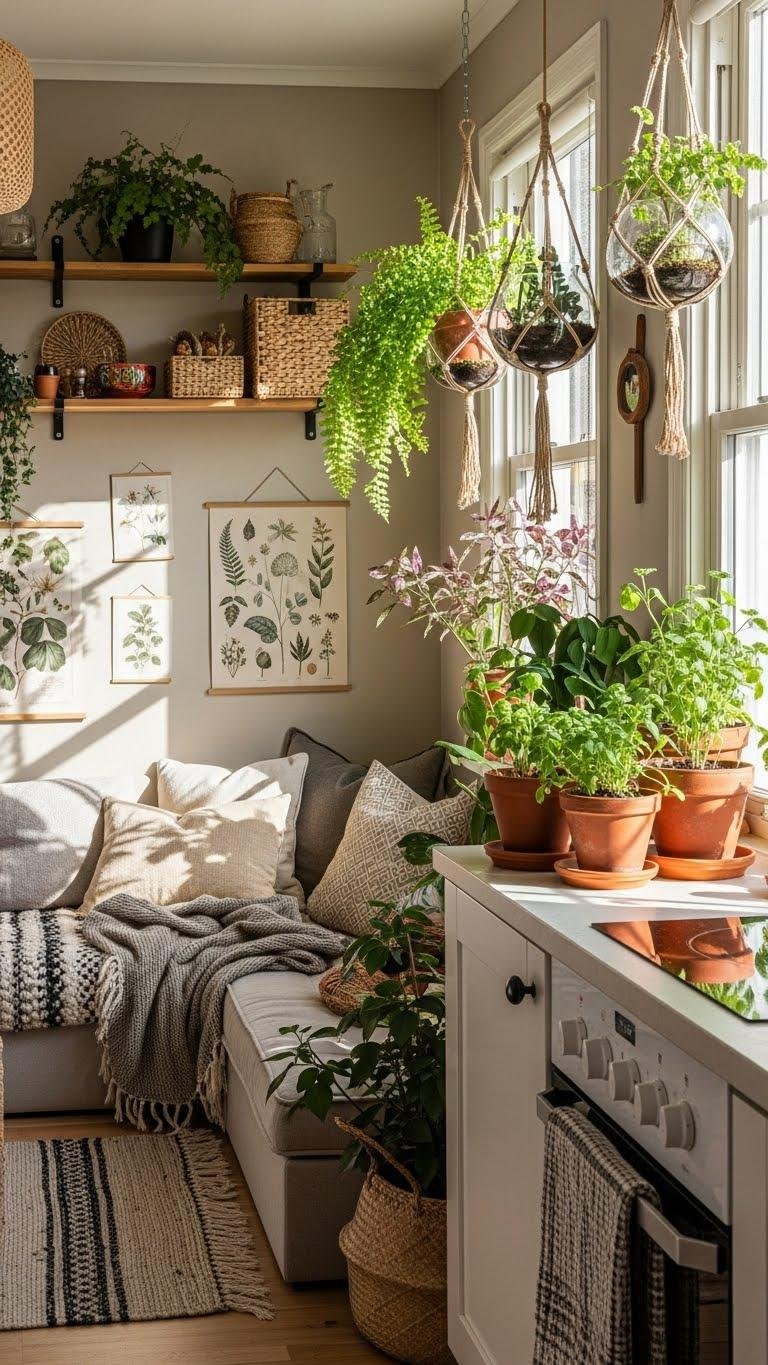 You’ll tuck potted ferns on shelves, suspend hanging terrariums by windows, and cluster herbs on kitchen sills.