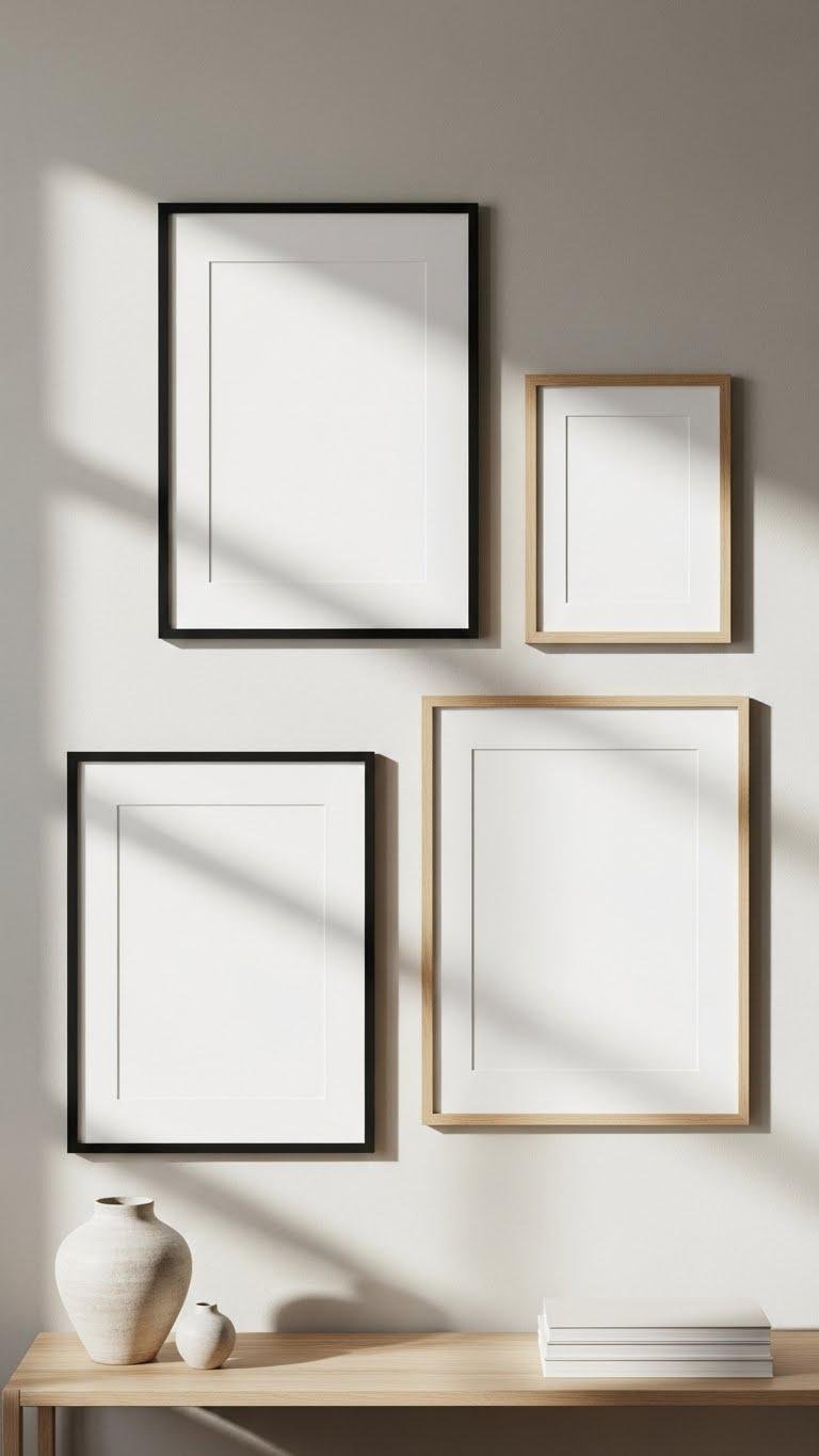 Choose a few well-crafted frames and let the artwork breathe — pared-down, purposeful framing keeps focus on the piece and lifts the whole room. You’ll pick minimal frames to showcase curated prints, honor negative space, and avoid clutter. Place pieces with purposeful placement: stagger heights, anchor a small gallery above a console, and keep sightlines open so each piece feels free and intentional.