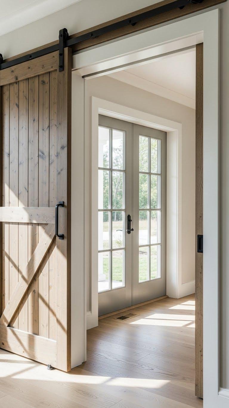 If you love the rustic look of barn doors but want cleaner sightlines and better sound control, swapping them for pocket or French doors can give rooms a more refined, livable feel without losing farmhouse character.