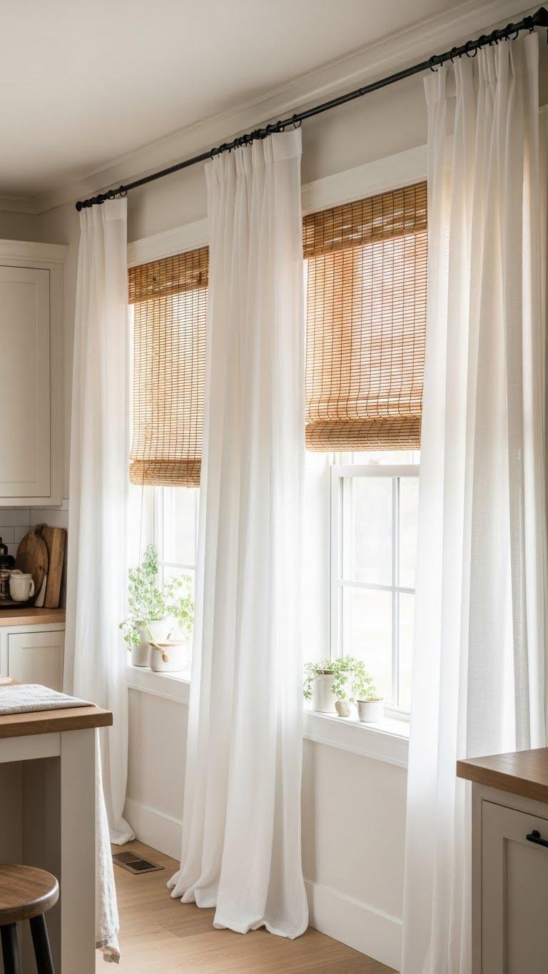 You’ll favor sheer curtains for diffused daylight and a lived-in look, pairing them with adjustable bamboo shades when you want shade or texture.