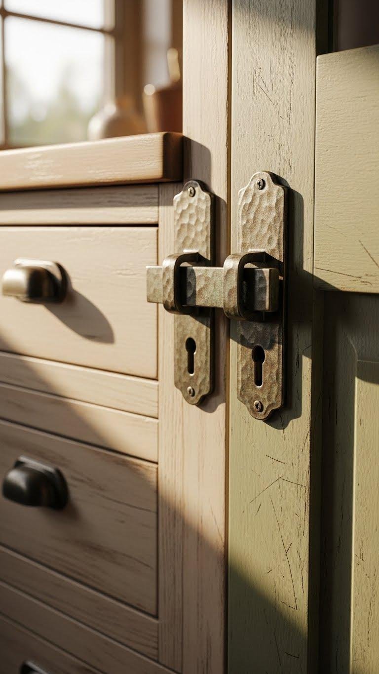 If you want your farmhouse to feel lived-in and layered, swap shiny new pulls and knobs for distressed or aged metal hardware that carries character without shouting. Choose pieces with antique latchwork, hammered edges, and soft patina accents to anchor cabinets, doors, and drawers. You’ll create subtle contrast, let imperfections tell stories, and enjoy a freer, more relaxed home that ages gracefully.
