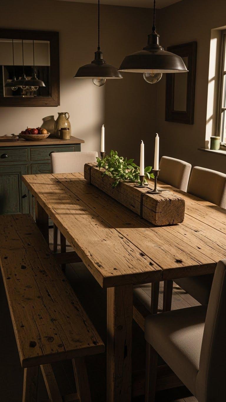 Anchoring your dining area with a reclaimed oak table brings instant character and history into the room, its weathered grain and hand-hewn edges creating a warm, lived-in focal point.