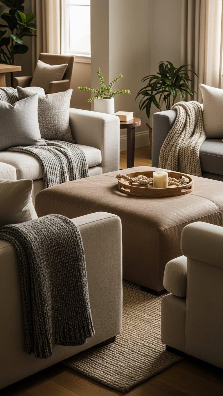 Layer soft taupe on trim, bring muted terracotta through pillows and pottery, and add linen throws for texture.