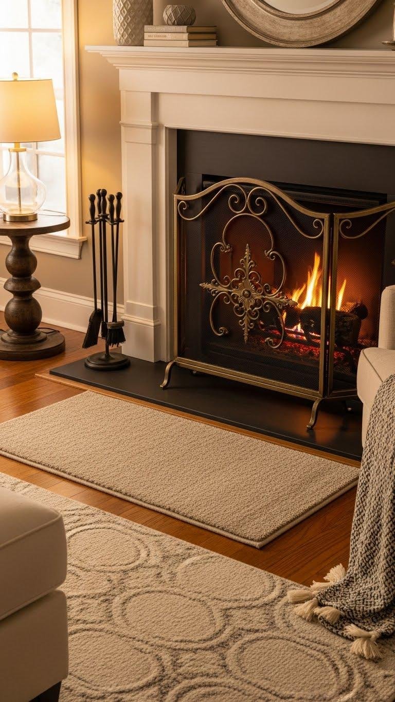 Pull a room together and protect your floors with a thoughtfully chosen hearth rug and a fireproof decorative screen that both complement your mantel’s style.