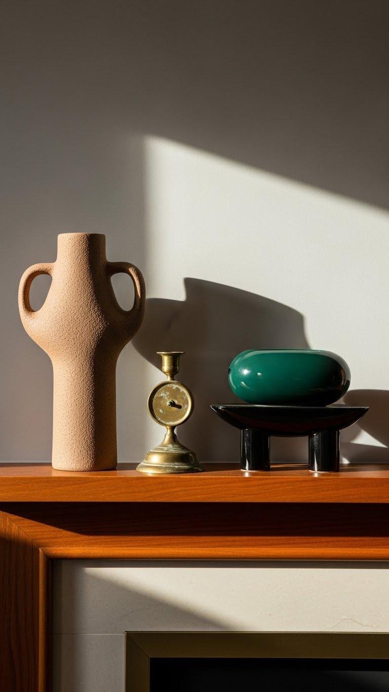 If symmetry gives your mantel calm, try shaking things up with an odd-numbered, eclectic grouping to bring energy and personality. You’ll assemble an asymmetrical trio that feels deliberate, not random — a sculptural vase, a vintage find, and a modern art object. Embrace a mixed texture trio to add tactile contrast and effortless freedom; edit boldly until the composition sings.