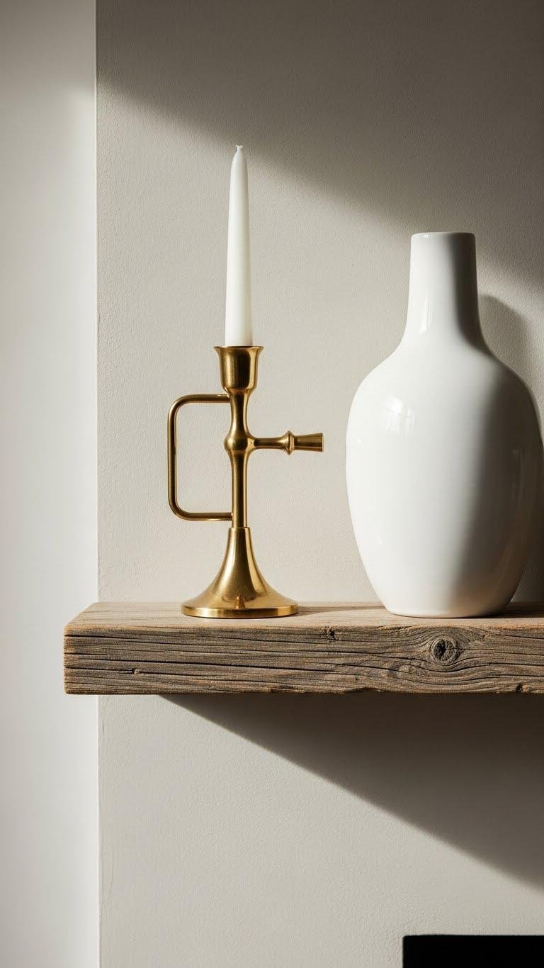 Choose antique brass with fluted columns and mirrored bases, topped with tapered candles. You’ll create a restrained, liberating look that feels orderly yet effortlessly elegant.
