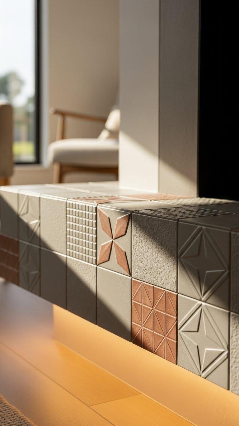 Bring texture down to the hearth to give the whole fireplace a tactile, grounded finish. You’ll choose textured mosaics or tiles with geometric relief to anchor the space, creating rhythm without overpowering it. Lay patterns that echo room lines, keep grout subtle, and let the hearth invite barefoot freedom. That deliberate, restrained approach elevates the fireplace while staying modern and personal.