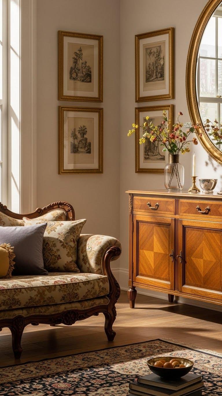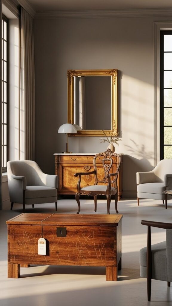 [IMAGE PROMPT: A serene, stylish interior scene centered on a single well-chosen antique—an ornate wooden chest, gilt-framed mirror, or carved chair—anchoring a modern living room. Soft natural light filters through tall windows, casting warm golden tones and gentle shadows on muted neutral walls and minimalist contemporary furniture arranged around the antique. Textural details: visible patina, worn wood grain, subtle scratches, and a small provenance tag; color palette of warm browns, cream, soft gray, and brass accents; balanced composition with the antique slightly off-center, creating harmony and quiet elegance in a photorealistic, editorial-style rendering.]