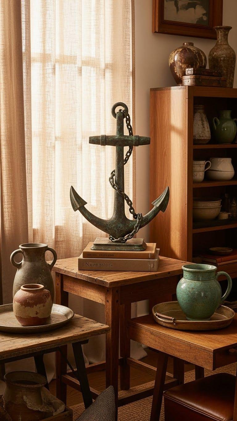 Layer in timeworn finishes and antique ceramics to give your space a lived-in, curated soul—start small and let each piece tell its own story.