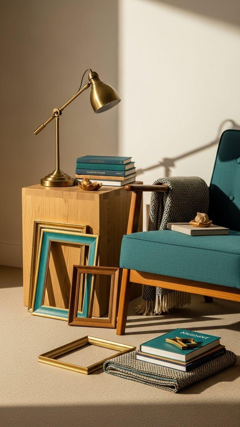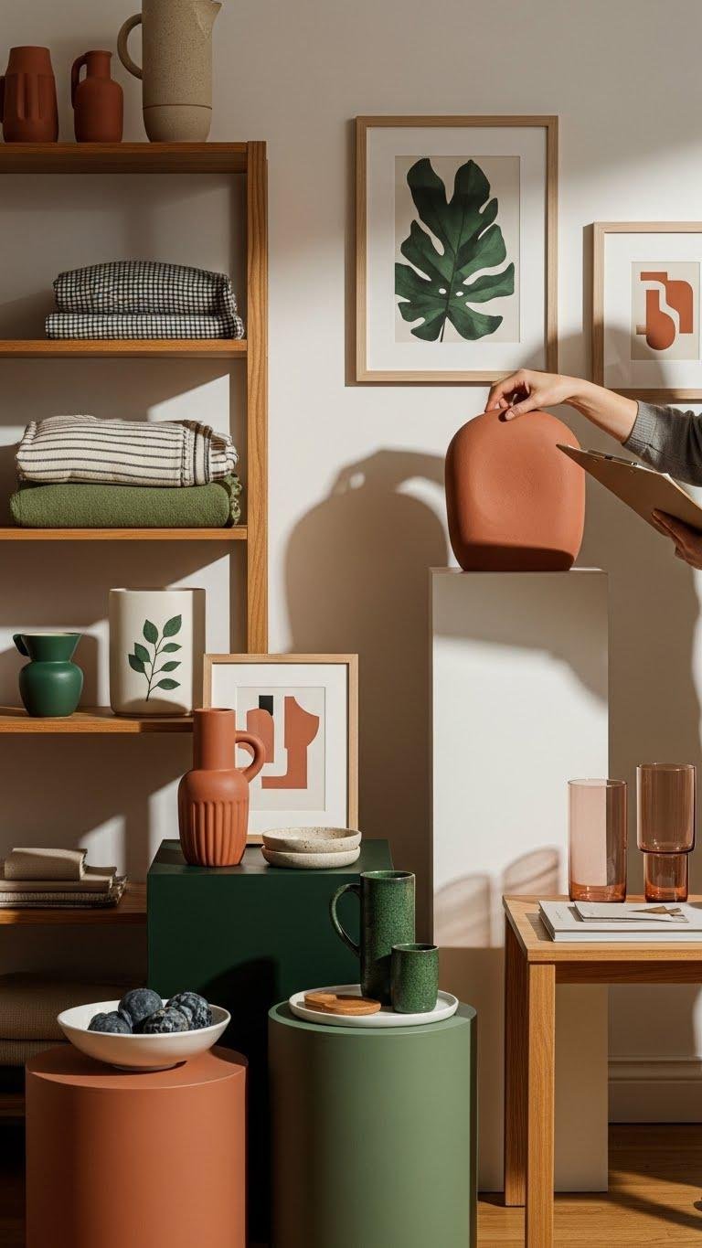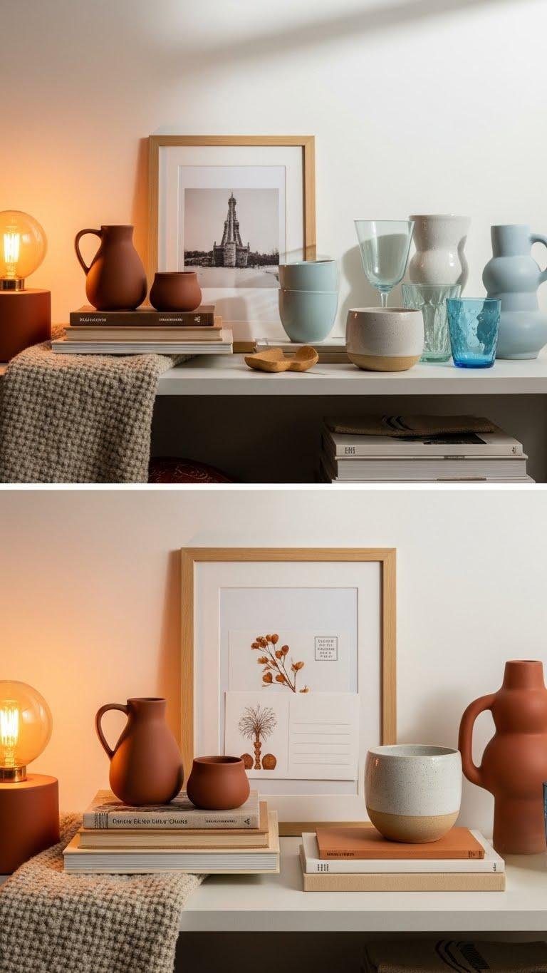 Though the big pieces set the tone, swapping small finds seasonally keeps your space feeling fresh and intentional: curate a short rotation of ceramics, books, framed postcards, and sculptural accents that you rotate every few months, pairing warmer textures and terracotta hues for fall and cozy layers, then lighter ceramics and glass with breezy blues for spring.