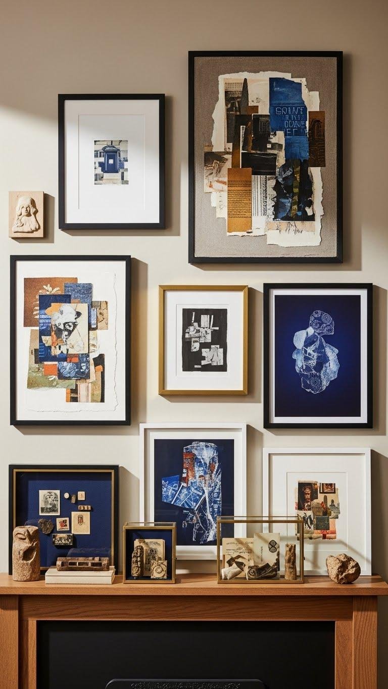 Mix original collages with sleek prints, vary frame finishes, and place found ephemera in shadowboxes or on mantels.