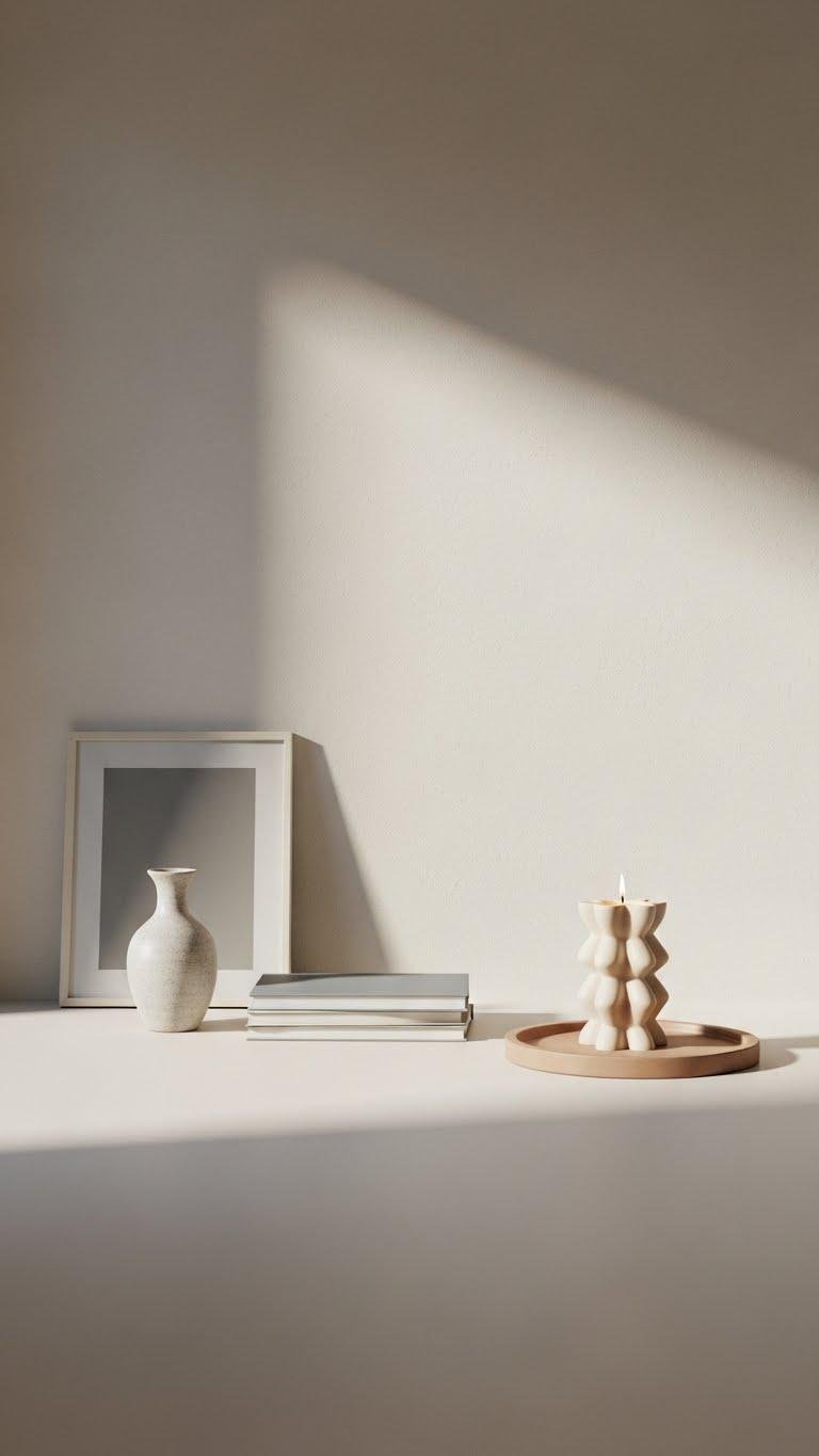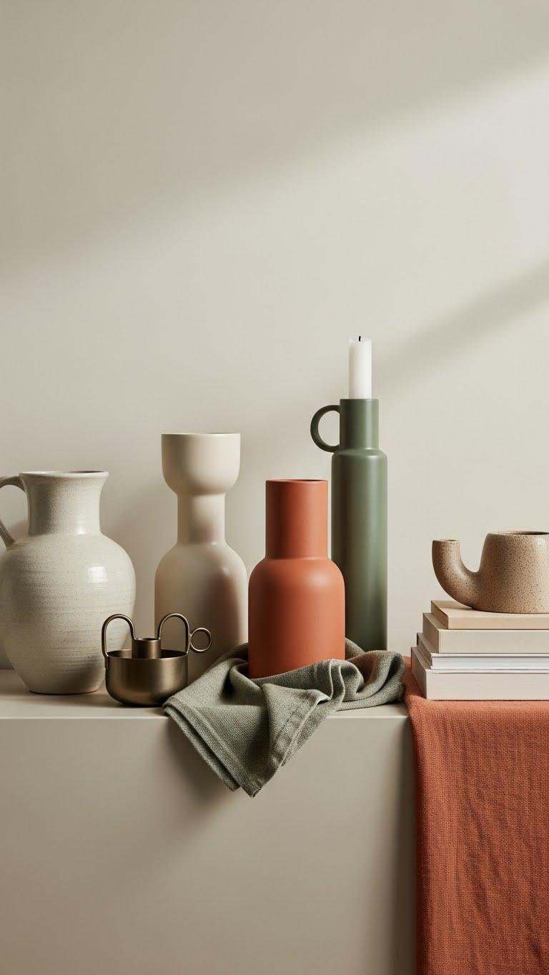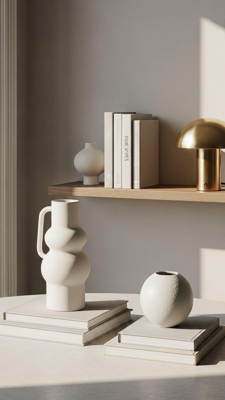 You’ll favor minimal surfaces and intentional curation: limit pieces to purposeful forms, vary scale and texture, and leave negative space.