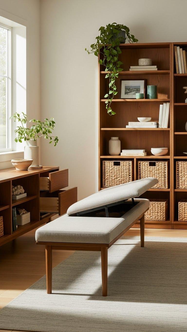 Think about furniture that pulls double duty: a credenza with open shelving and concealed drawers, a bench with hidden storage beneath a slim seat, or a bookcase whose lower cubbies hide baskets while the top becomes a curated display.