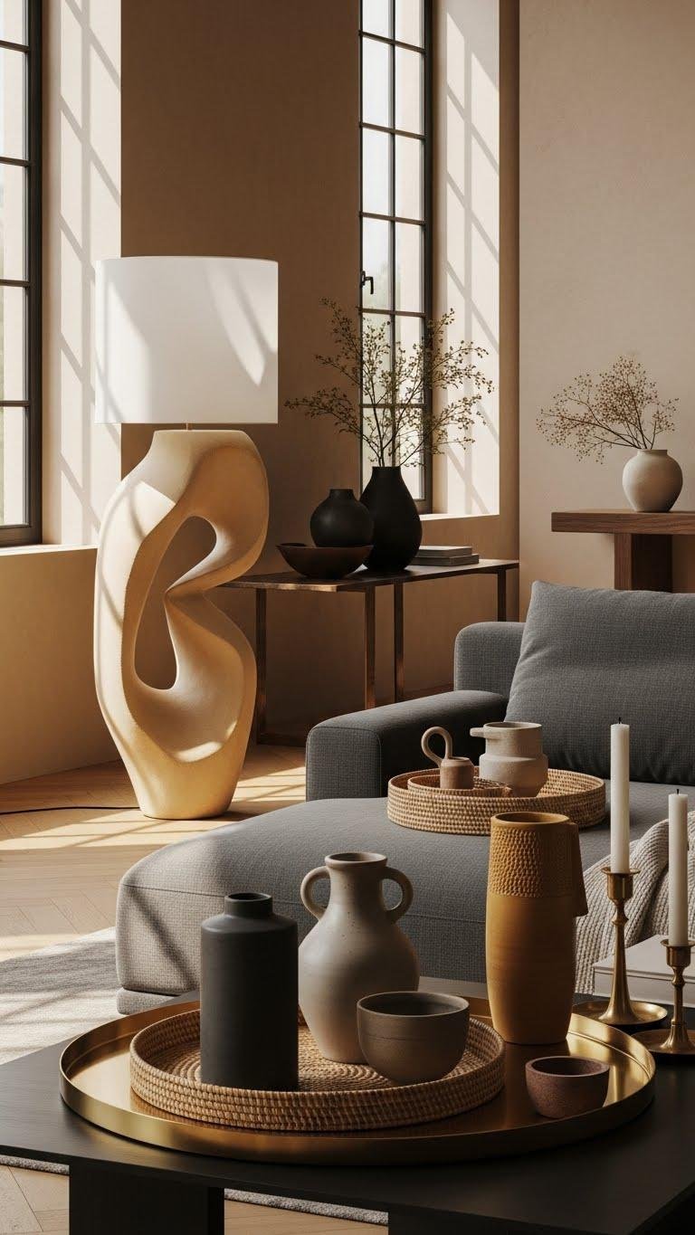 Choose just a handful of objects per surface and let each one earn its place—functional items, a sculptural vase, or a single stack of books—so the room reads as deliberate, not crowded.