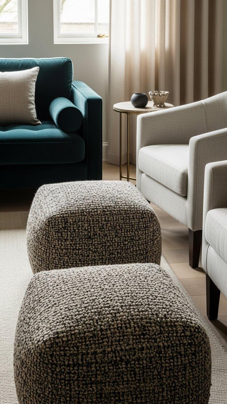 Mixing upholstery textures gives your room depth and invites touch—you want fabrics that contrast and complement, not fight. Choose velvet vs. linen strategically: velvet for drama and rich color, linen for ease and breathability. Add boucle accents for sculptural softness.