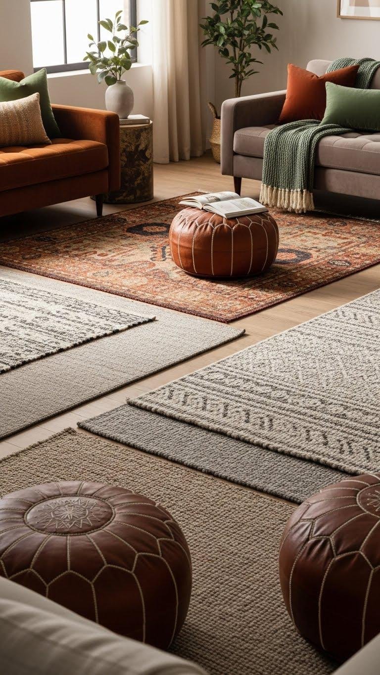 After you’ve arranged varied upholstery to invite touch and define seating, rugs do the same for the floor—giving each area its own purpose and softening hard surfaces underfoot. You’ll use rug layering to anchor traffic patterns, contrast textures, and clarify zone definition without clutter. Choose scale, color, and pile deliberately so each layered piece reads as intentional freedom, not accidental accumulation.