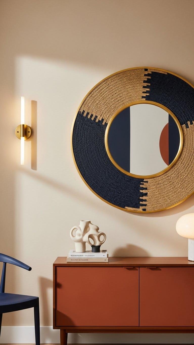 Choose an oversized mirror or bold textile as your anchor, then balance with a compact sculpture and layered architectural lighting.