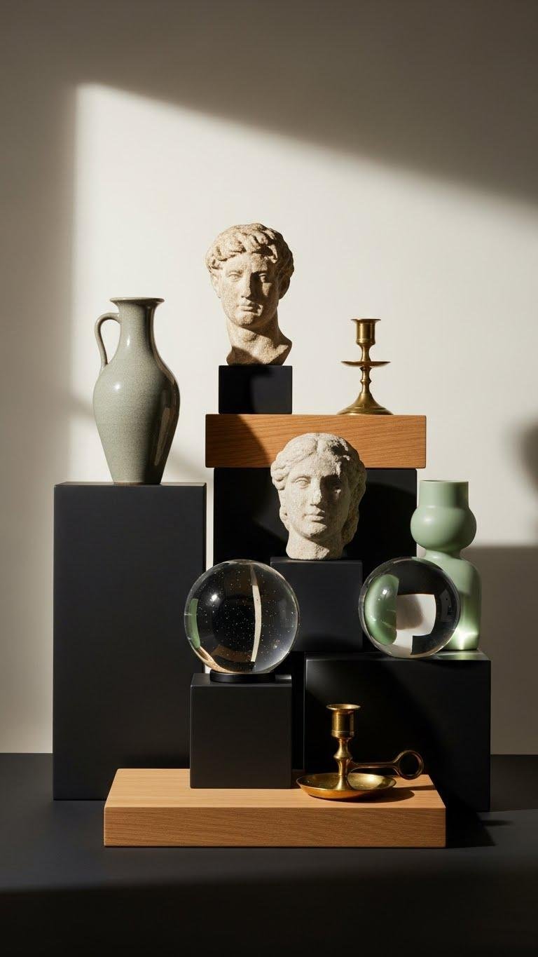 If you want your collected pieces to read as a cohesive statement, give them a common base—same color, material, or platform—to visually unify varied shapes and eras.
