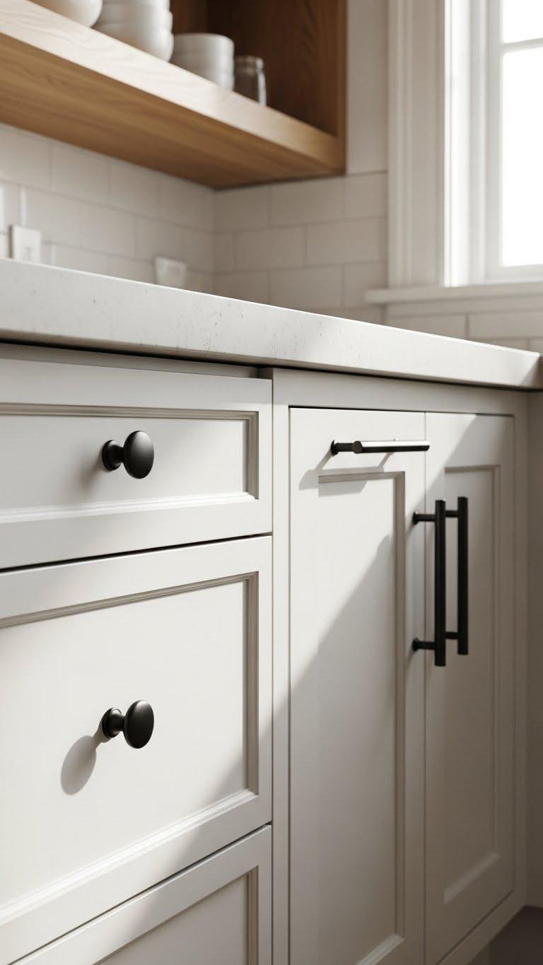 Choose matte black knobs on drawers and satin black pulls for cabinets to create cohesive contrast.