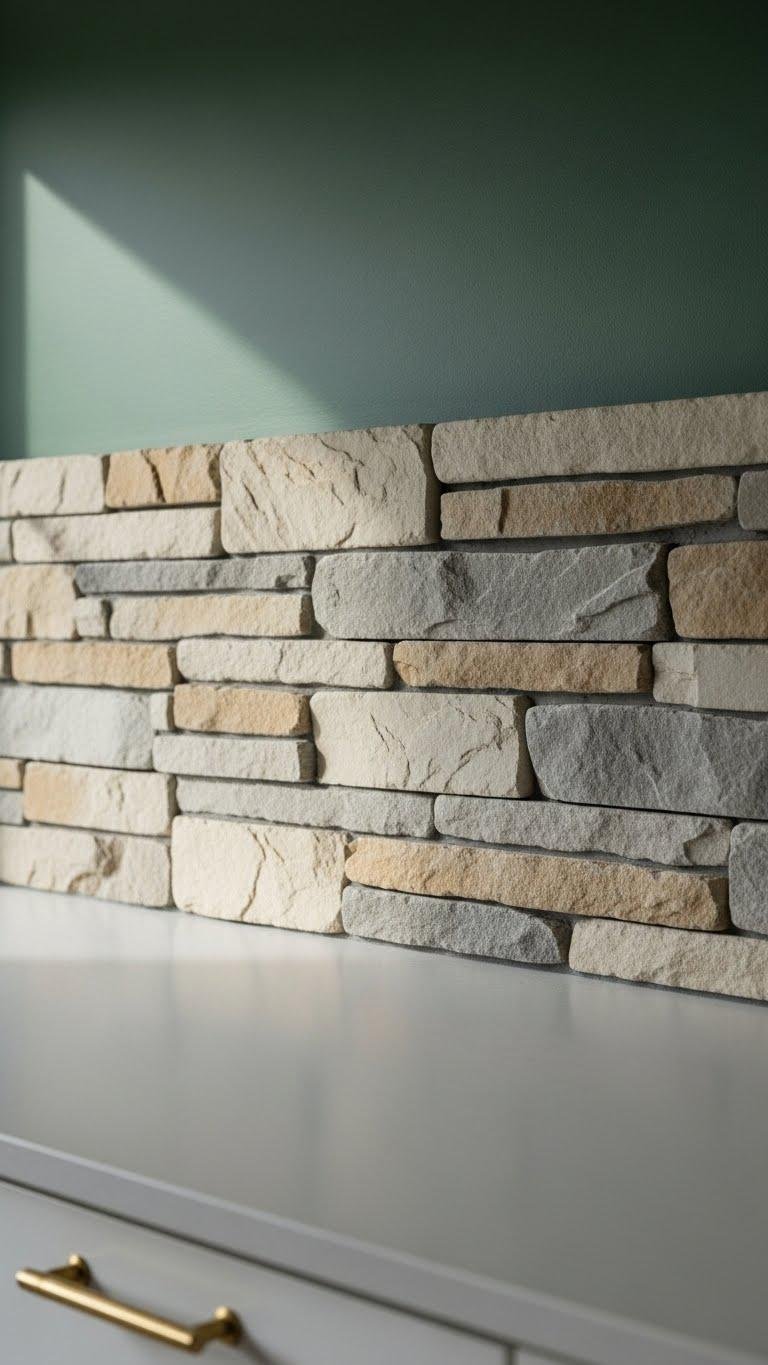 Pairing a mixed-texture natural stone backsplash with your forest green accent brings tactile depth that keeps the scheme from feeling flat. You’ll choose stacked veneer for variation, combine honed and split-face pieces, and finish with textured grout to emphasize joints. This approach feels modern yet grounded, gives you visual freedom, and keeps maintenance simple while elevating the kitchen’s clean, intentional aesthetic.