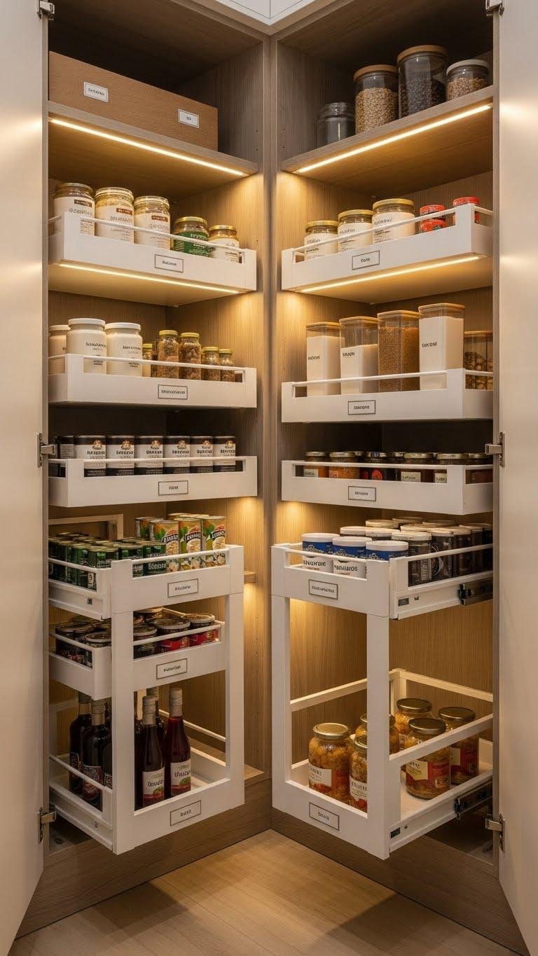 Add focused pantry lighting and a simple label system so you grab what you need, keep inventory, and move freely through meal prep.