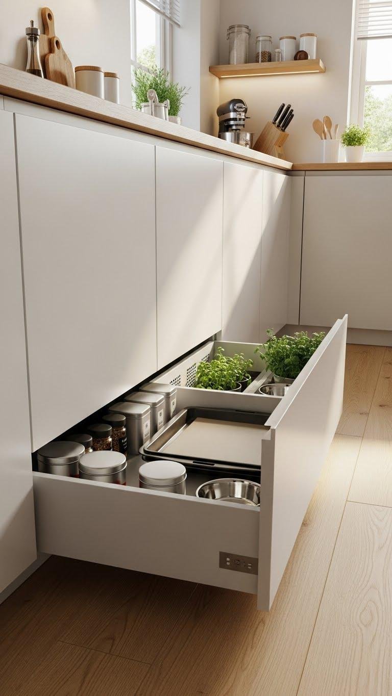 You’ll gain slim, efficient compartments that feel liberating — ideal for spices, baking sheets, or pet dishes. Integrate ventilated drawers to keep items fresh and dry.