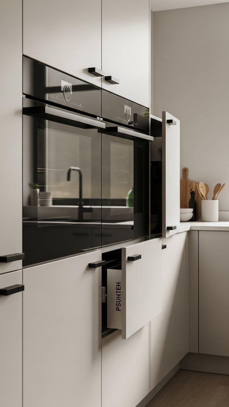 Matte black hardware gives your kitchen a defined, restrained look; to keep that calm minimalism going, hide bulky appliances behind flush panels. You’ll embrace clean sightlines by integrating panelized appliances into seamless cabinetry, keeping form functional without fuss.