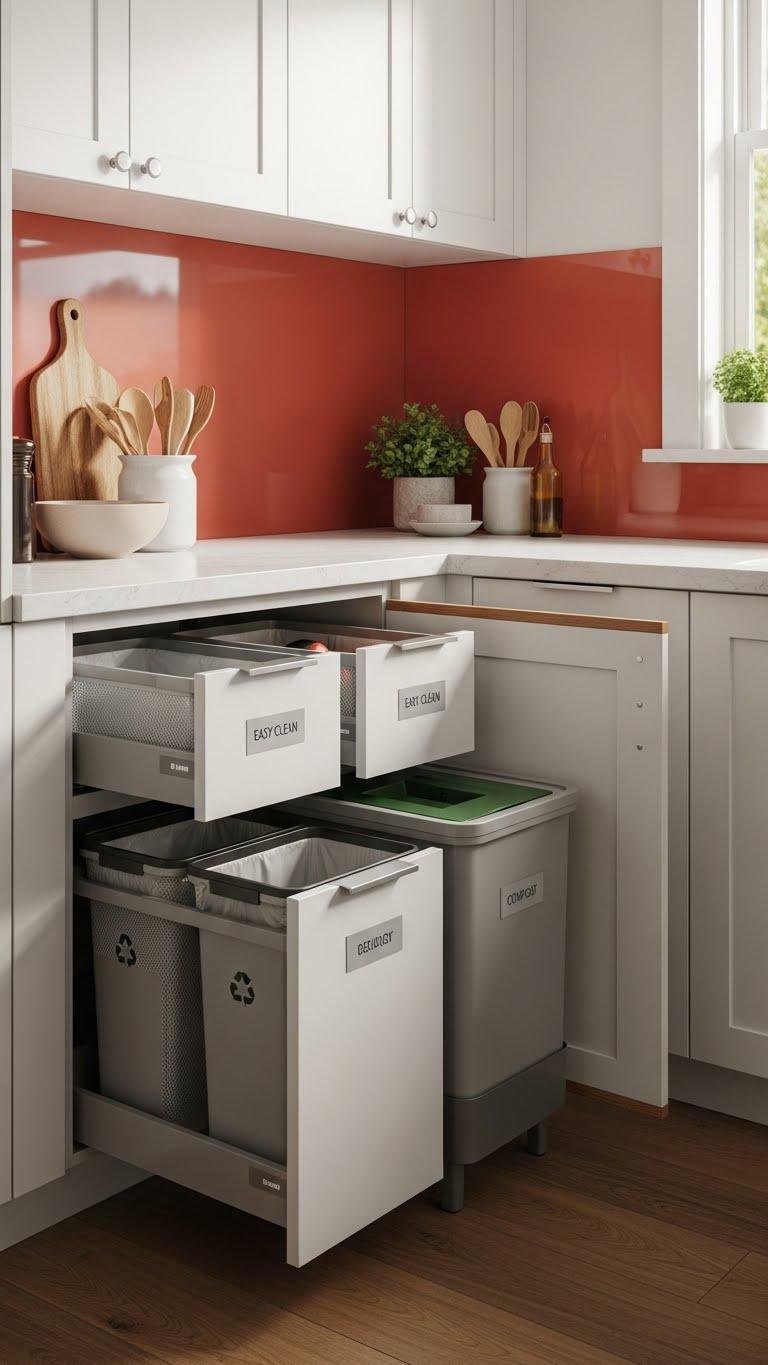 After you’ve used a bold backsplash to give the kitchen personality, make the rest of the space work smarter by integrating built-in recycling and compost centers. You’ll free counter space and simplify sorting with partitioned bin drawers and discreet under counter composting systems. Choose durable materials, easy-clean liners, and intuitive labeling so recycling feels effortless and your kitchen stays calm, efficient, and liberated.