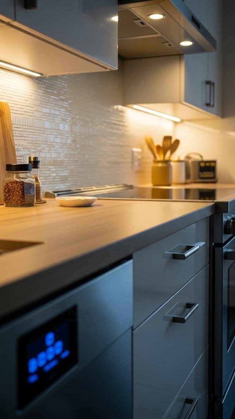 Flip on under-cabinet lighting to instantly sharpen countertops, showcase backsplashes, and make prep safer and more efficient. You’ll choose slim LED strips for even, invisible illumination that lifts materials without clutter. Install Task dimming so light matches mood and function — bright for chopping, low for ambiance. It’s a modern, freeing upgrade that reads clean, practical, and confidently current.