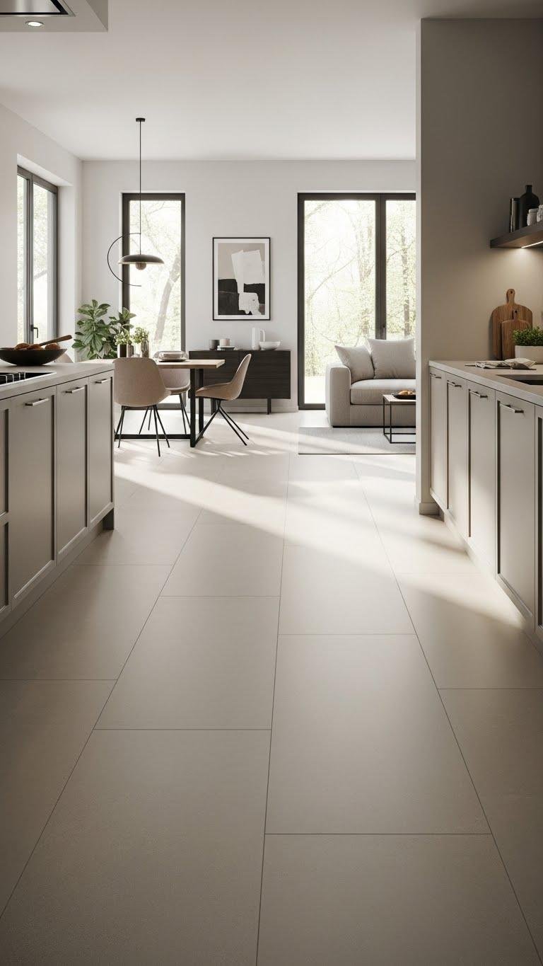 Choose large-format tiles to stretch your floor visually and create an uninterrupted, calm foundation for the whole kitchen. You’ll enjoy seamless flow between zones with thoughtful large format shifts and fewer visual breaks. Use grout minimization techniques — wider tiles, color-matched grout, tight joints — to simplify maintenance and amplify a liberated, airy aesthetic that feels modern, clean, and deliberately effortless.