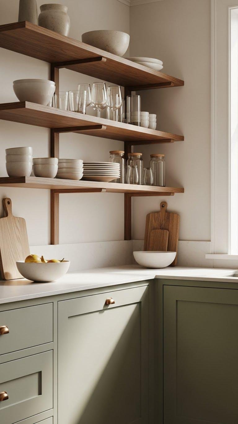 Pairing sage green cabinets with open walnut shelving keeps the palette grounded and adds tactile warmth, so you can show off both form and function. Choose slim walnut brackets and staggered boards for an airy, open plan shelving look that highlights ceramics and glass.