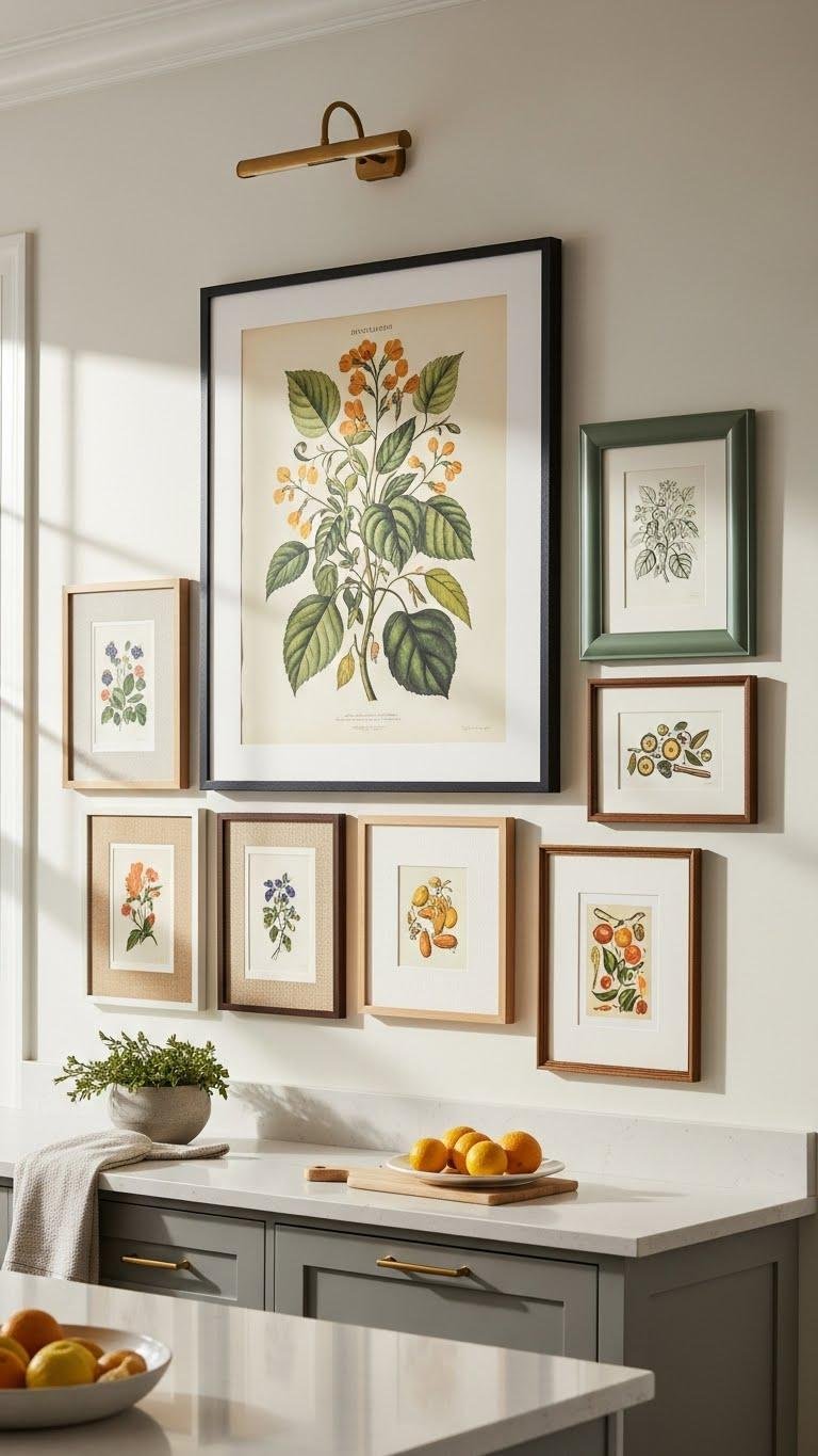 Start with a bold, statement anchor piece—think an oversized vintage botanical, a dramatic abstract, or a framed culinary print—that sets the room’s tone and scale.