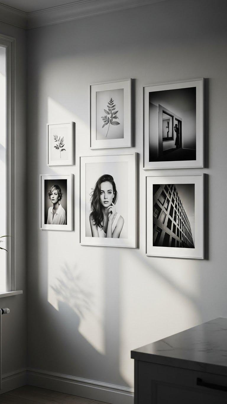 Lean into a monochrome photography gallery to give your kitchen a sleek, modern calm—think high-contrast portraits, soft-focus botanicals, and architectural studies in black, white, and gray that read like art rather than decor. You’ll curate high contrast prints and explore tonal textures to craft a liberated, composed wall. Mix frame sizes, stagger spacing, and let negative space breathe for a minimal, bold statement.