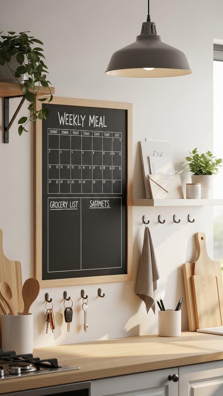 Though it’s practical, a chalkboard menu and family command wall also turns your kitchen into an organized, visual hub you actually want to use. Paint a matte panel, add a chalkboard calendar for meals and errands, hooks for keys, and a slim shelf for mail. You’ll craft a minimalist command center that’s flexible, stylish, and frees your routine without clutter or fuss.