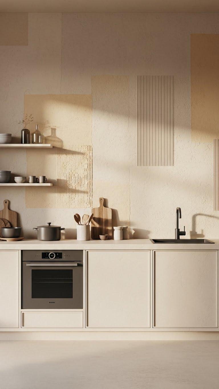 Wondering how to make your kitchen feel cozy without overwhelming it? Choose a warm minimalist textured accent wall using textured plaster in warm neutrals to add depth without clutter.