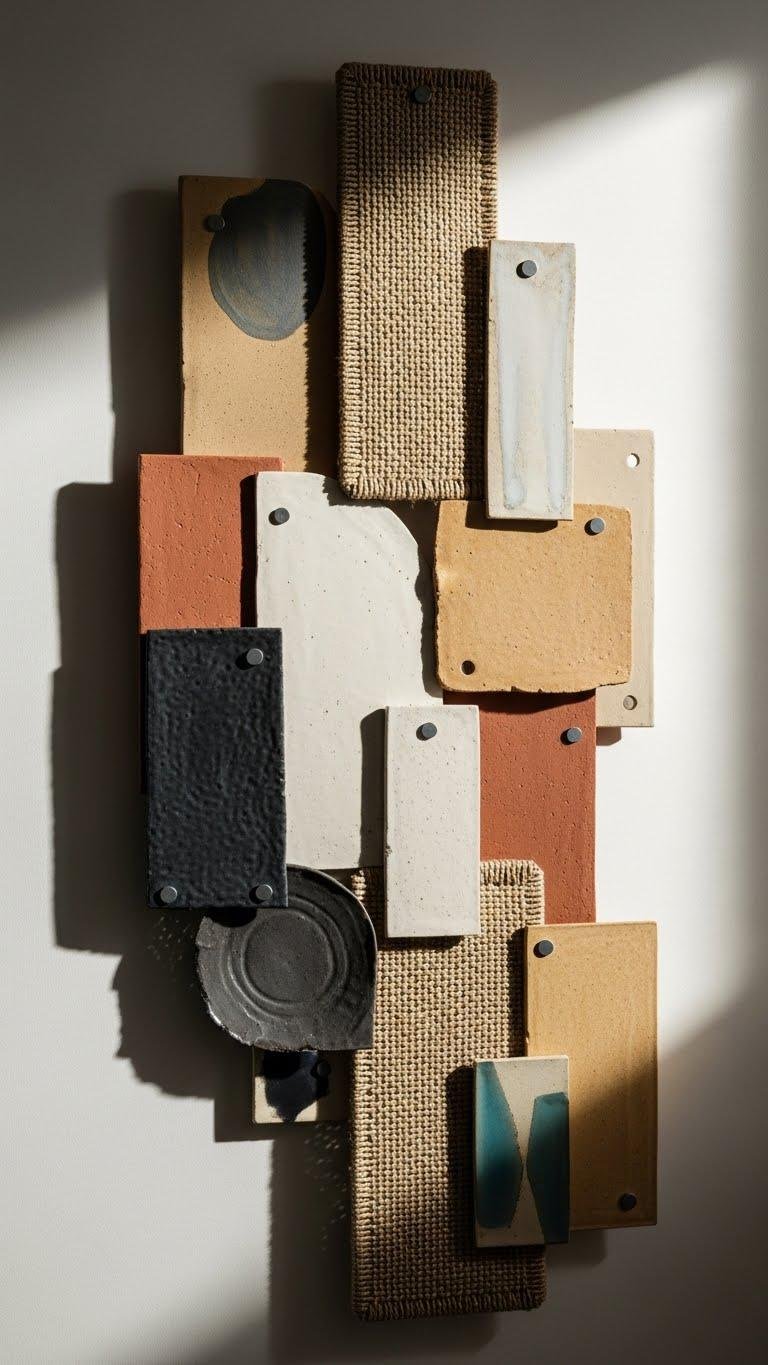 Play with scale and spacing to create an eye-catching asymmetrical cluster of ceramic or woven panels that reads like a curated textile collage.
