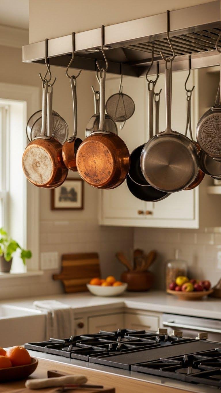 Move the eye from gallery-like walls to functional art you can touch: a hanging pots-and-pans display turns cookware into a sculptural focal above a stove or island. You’ll choose exposed copper pieces and mix finishes, arranging them on asymmetrical hooks for relaxed rhythm. It frees your counters, signals lived-in luxury, and invites you to cook, grab, and rearrange with effortless style.