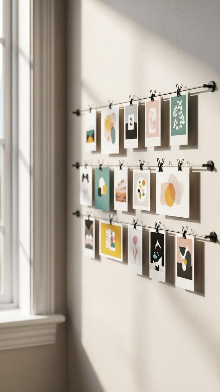 If a multi‑panel canvas sets a steady, architectural rhythm, a rotating small‑format print display keeps the wall feeling fresh and personal. You’ll mount a simple grid or wire, use magnetic clips for effortless changes, and swap postcards, photos, or mini art for seasonal swaps. The result is a playful, modern gallery you can edit anytime — light, flexible, totally yours.