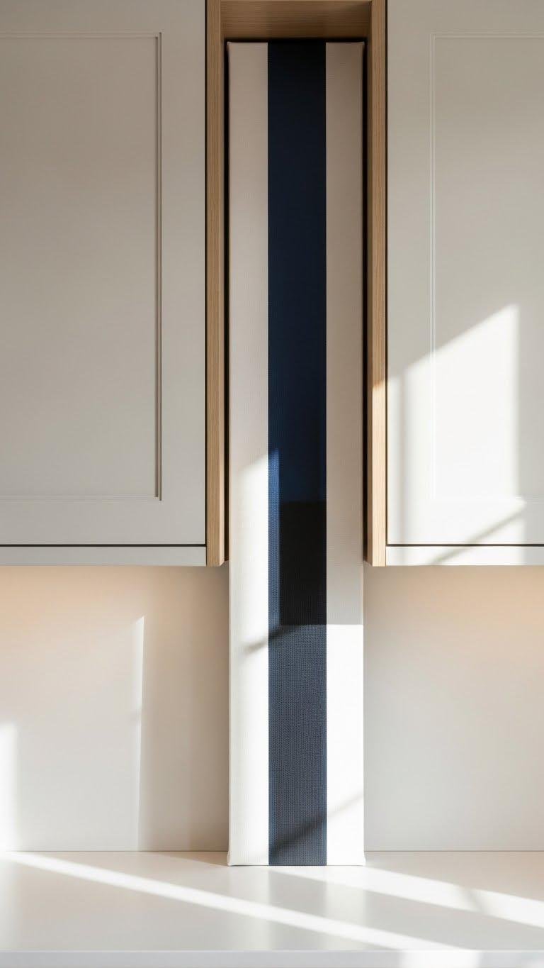You’ll pick slim artwork that echoes cabinet tones or injects a bold stripe for movement. Add subtle vertical lighting to emphasize texture and guide the eye upward.