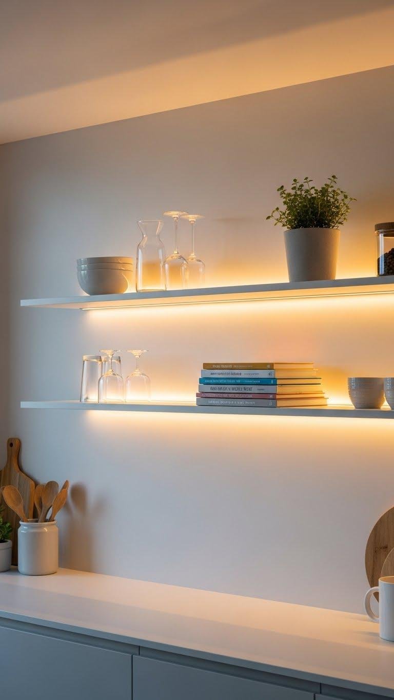 A pair of slim floating shelves with warm LED backlighting instantly upgrades your kitchen’s mood and functionality: they create soft, indirect illumination that highlights glassware, cookbooks, or that stray herb jar without cluttering countertops.