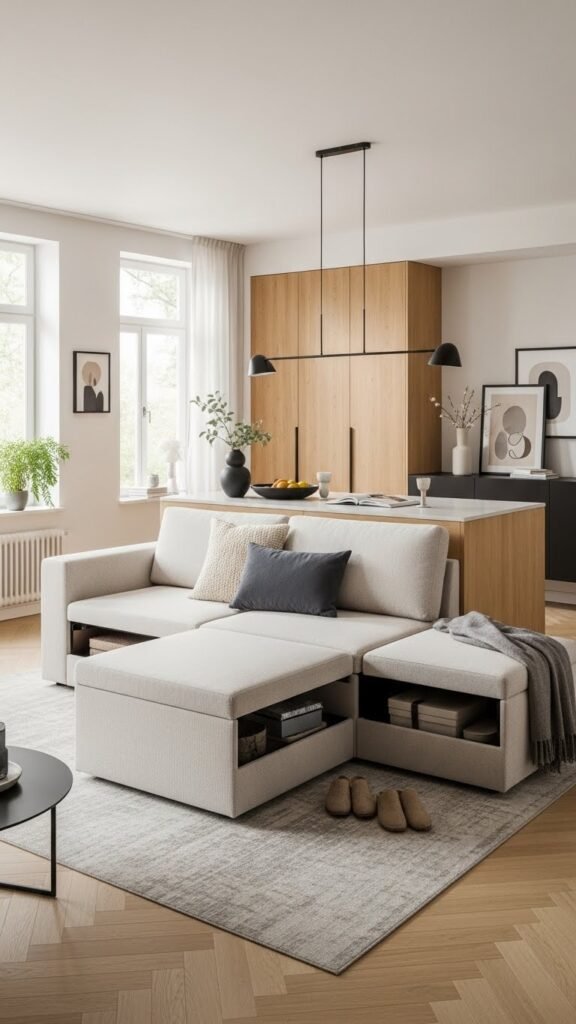 You’ll choose modular seating, built-in hidden cabinetry and convertible ottomans to store gear, rotate zones quickly, and maintain clean lines. This approach feels liberating, efficient, and utterly contemporary—perfect for flexible, unfettered living.