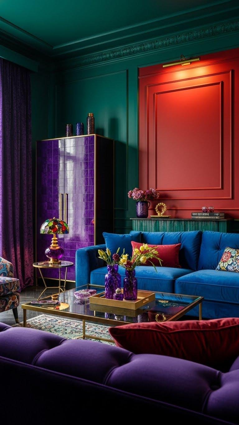 Plunge into deep jewel-toned drenching to give your living room an instantly dramatic, couture-ready feel: think saturated emerald walls, sapphire sofas, or a ruby accent wall that reads as art. You’ll layer velvet drapery and jewel tiles, choose gemstone accent furniture, and even install amethyst cabinetry for focal richness.