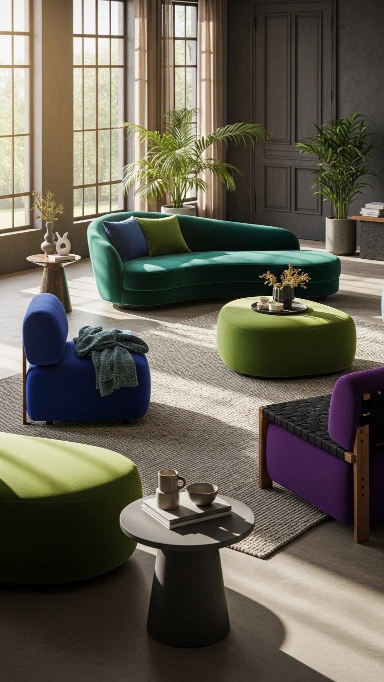 After bathing your space in jewel tones, soften the geometry with curved sofas and organic seating arrangements that invite conversation and movement.