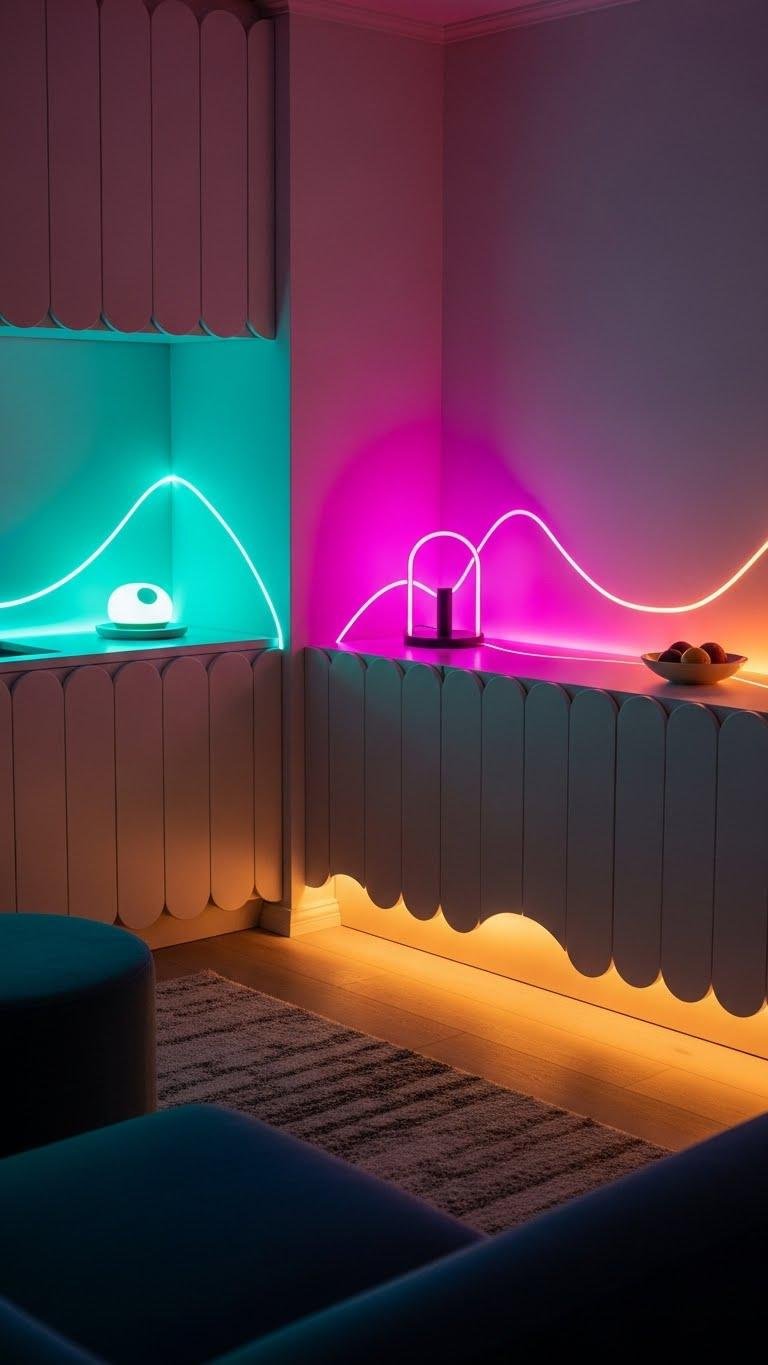 Scalloped cabinetry and wavy sideboards set a playful, sculptural tone—now bring that mood to light with customizable LED systems that let you sculpt ambiance as precisely as furniture shapes the room. You’ll use color changing strips to wash walls, highlight curves, and shift scenes instantly.