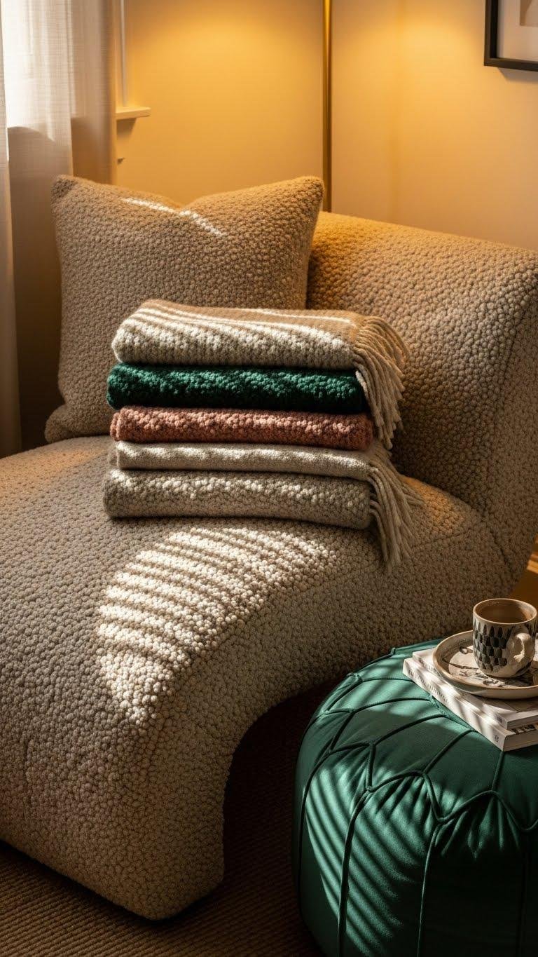 Curl up in a nook dressed in bouclé and velvet, where texture does the heavy lifting and color cues the mood—you’ll find the tactile warmth instantly makes reading feel like a ritual.