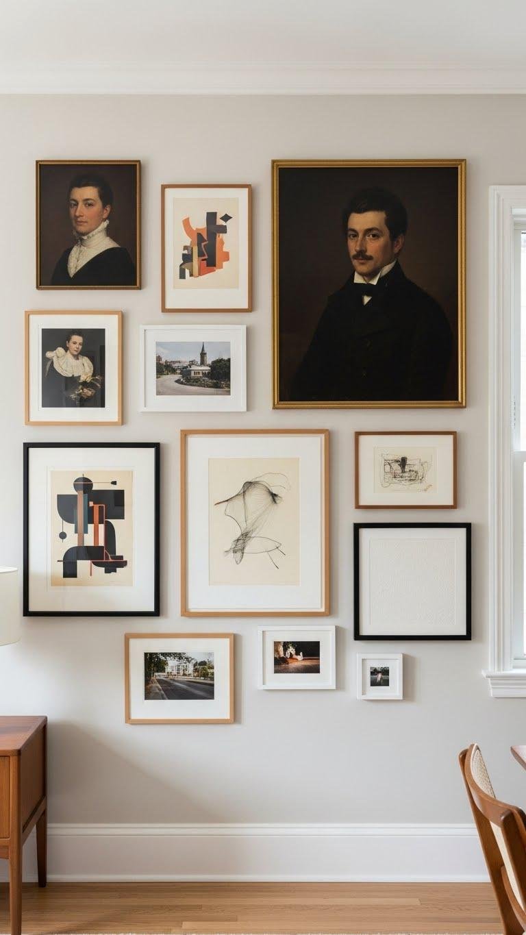Mix and match pieces from different eras to build a gallery wall that feels intentional rather than chaotic; you’ll anchor the composition with a few larger works and weave in smaller, contrasting pieces to create rhythm and balance.