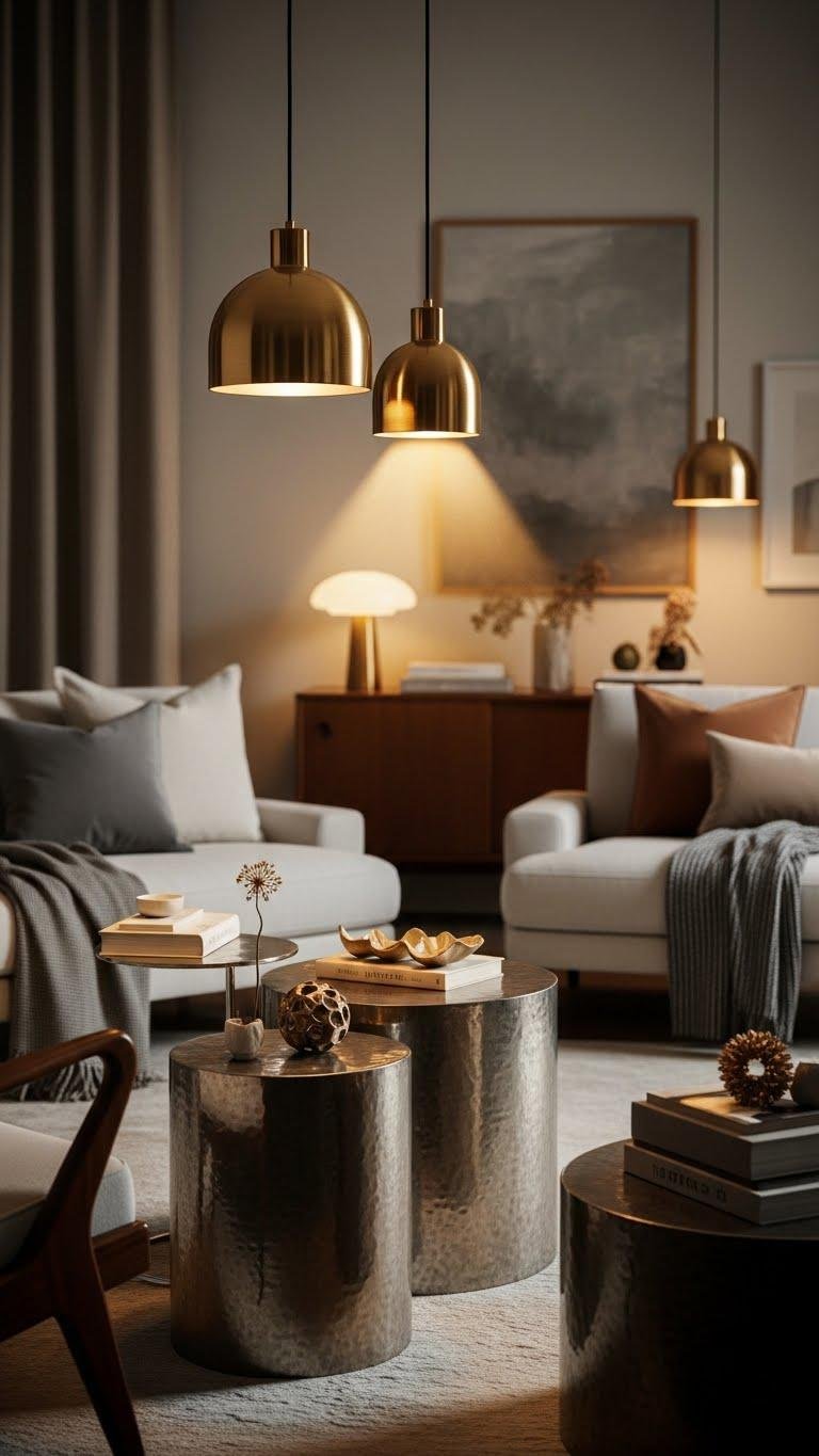 Choose brass pendants to define zones and cast warm light; pair with metallic side tables for reflective contrast. You’ll create a liberated, curated space that feels elegant, intentional, and effortlessly lived-in.